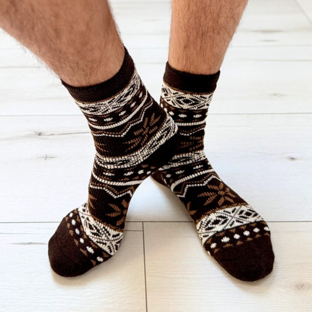 Brązowe skarpetki zimowe – ciepłe, miękkie, z norweskim wzorem