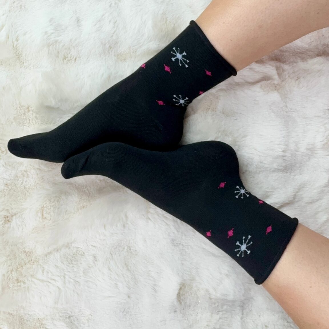 Czarne zimowe skarpetki bezuciskowe ze śnieżynką i różowymi akcentami
