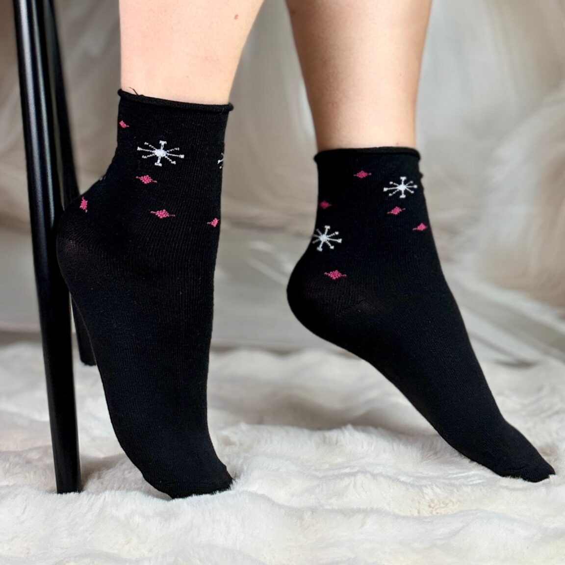 Te czarne zimowe skarpetki damskie ze śnieżynką i różowymi akcentami to idealny wybór dla kobiet, które lubią połączenie klasycznej czerni z delikatnym, zimowym motywem. Subtelny wzór śnieżynki w bieli oraz drobne różowe romby dodają im uroku i sprawiają, że świetnie pasują zarówno do codziennych stylizacji domowych, jak i jako drobny prezent na chłodniejsze miesiące.