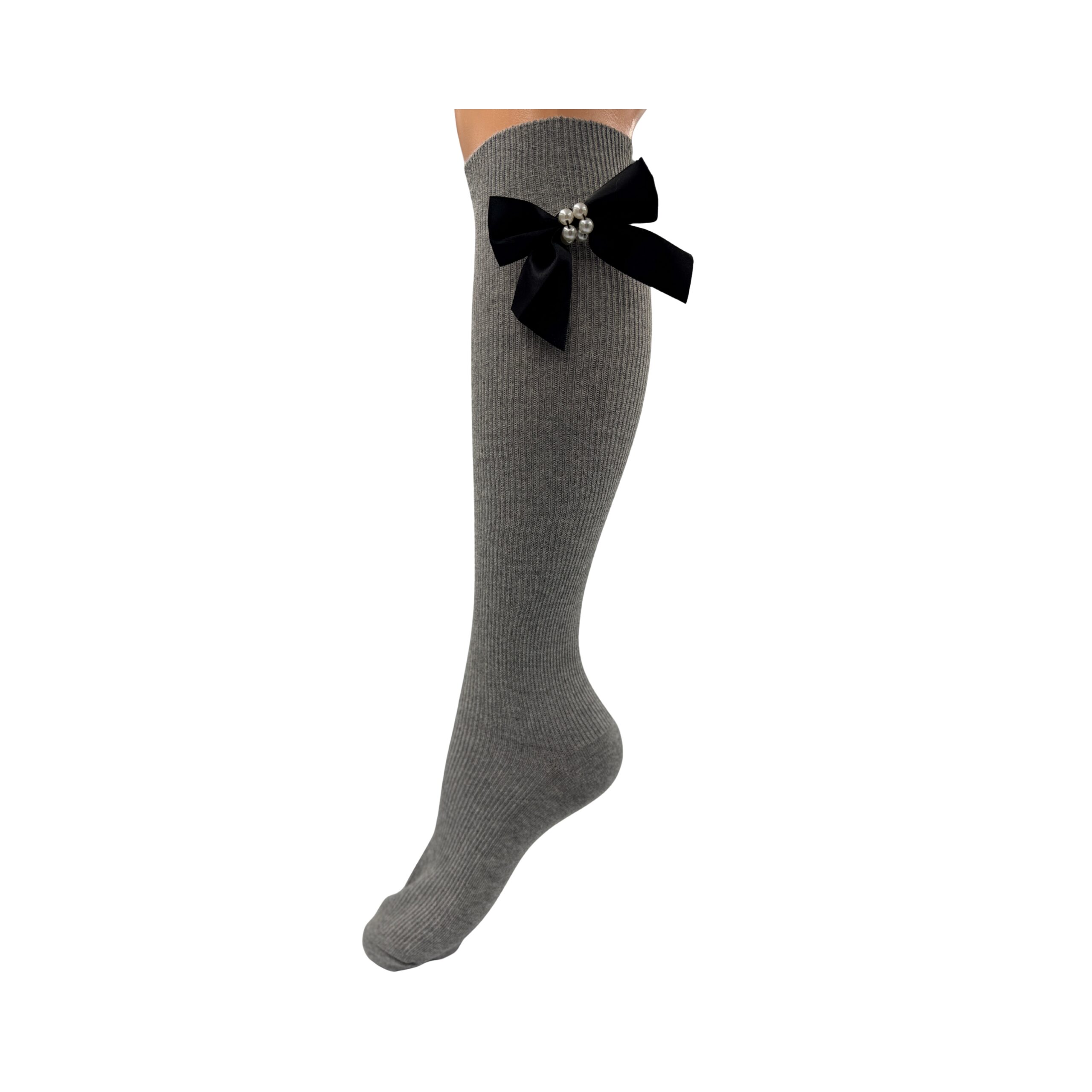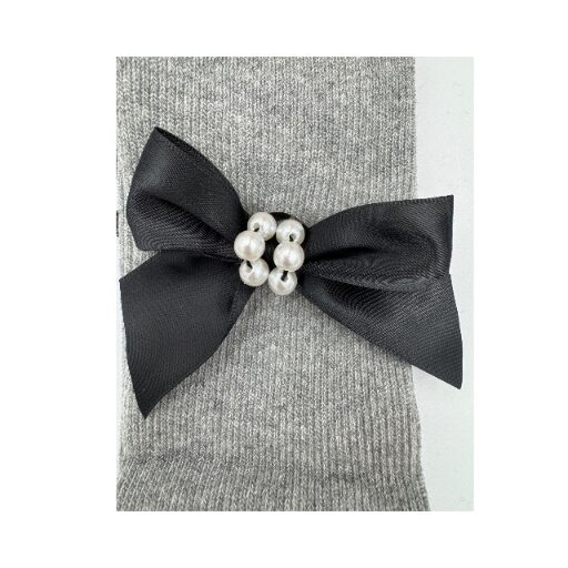 Podkolanówki z kokardą i perłami dla kobiety z wysokojakościowej bawełny. Z boku z czarną kokardą i perełkami. Można ozdobę odpiąć, bo jest na agrafce.