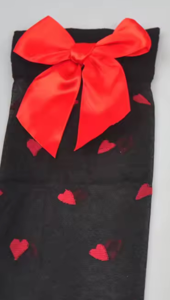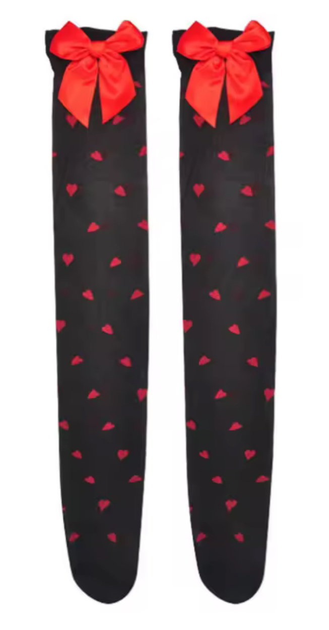 Zmysłowe pończochy z czerwonymi sercami i kokardą.