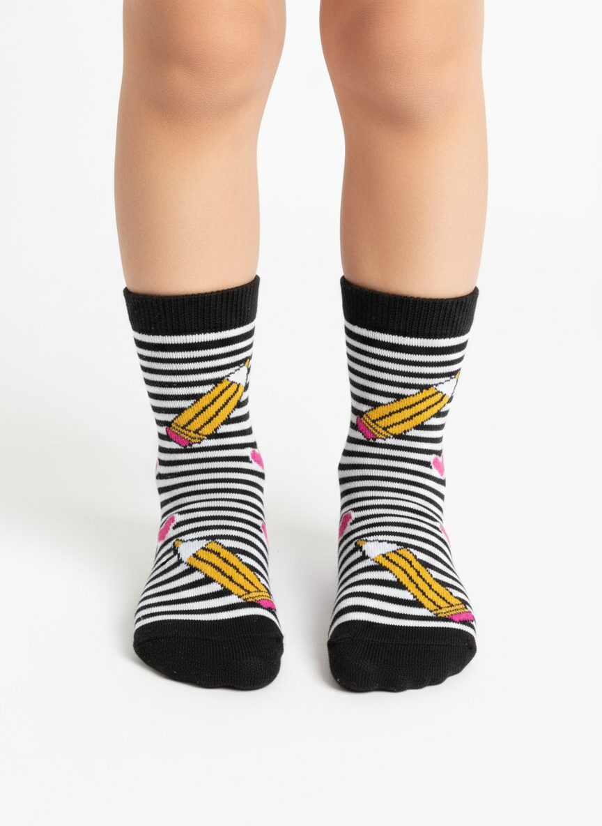 Wygodne i miękkie skarpetki dziecięce w czarno-białe paski oraz kredki. Idealne do przedszkola, szkoły, na spacer oraz do codziennego noszenia. Dzięki wysokiej zawartości bawełny zapewniają komfort i odpowiednią wentylację stopy przez cały dzień.
