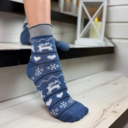 Skarpetki bezuciskowe niebieskie w norweskie, świąteczne wzory polecane są osobom z wrażliwą skórą, problemami z