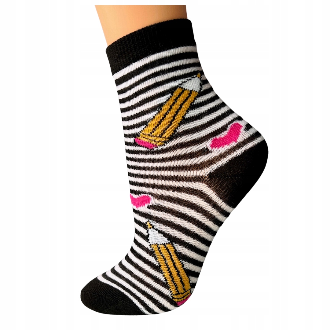 Skarpety bawełniane w kolorach szary, różowy oraz granat. W linijki, ołówki, farby oraz kredki. Idealne dla Twojego dziecka.
