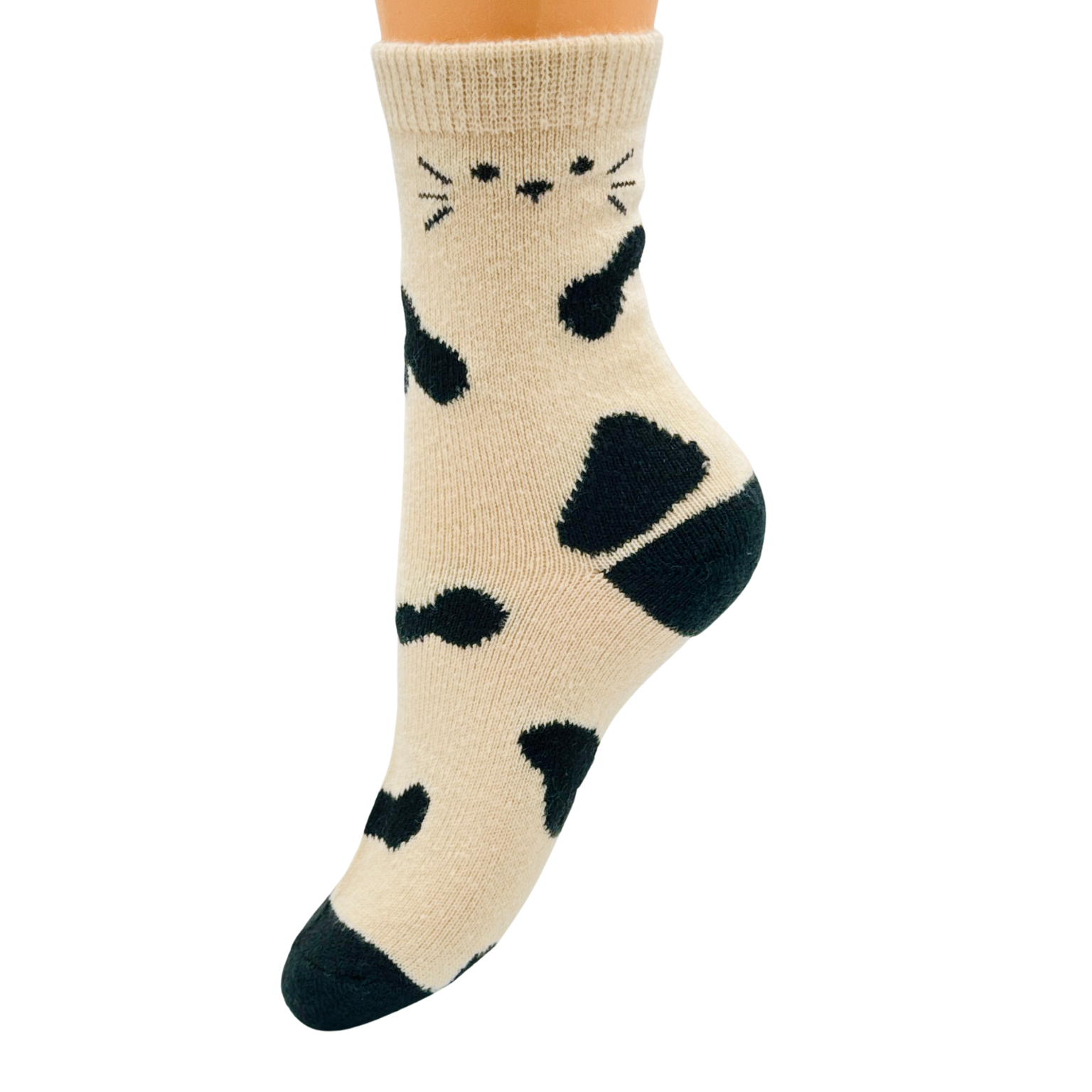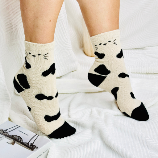 Styl i elegancja – stonowane, klasyczne kolory sprawiają, że pasują zarówno do domowego relaksu, jak i do bardziej eleganckich stylizacji zimowych. Dodatkowym atutem jest wzór w kotki.