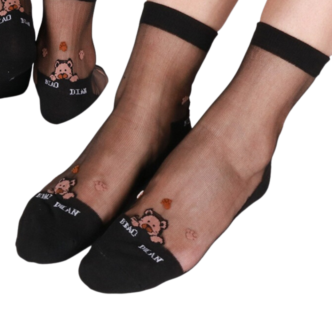 Czarne, przeźroczyste skarpetki z motywem misiów i ich łapek są idealnym połączeniem stylu i komfortu. Wykonane z najwyższej jakości bawełny, które zapewnia oddychający materiał, nasze skarpety sprawdzą się zarówno na co dzień, jak i na specjalne okazje.