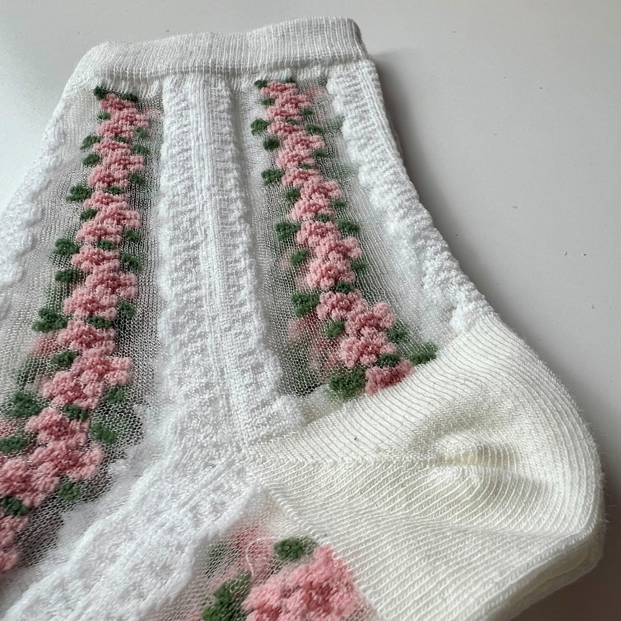 Dodaj swojej stylizacji lekkości i uroku! Te eleganckie skarpetki w paski i drobne, różowe kwiatki to połączenie modnego designu i wygody. Przezroczysty, siateczkowy materiał w paski i drobne, różowe kwiatki prezentuje się niezwykle kobieco, a czarne wykończenia przy palcach, pięcie i ściągaczu dodają całości charakteru.
