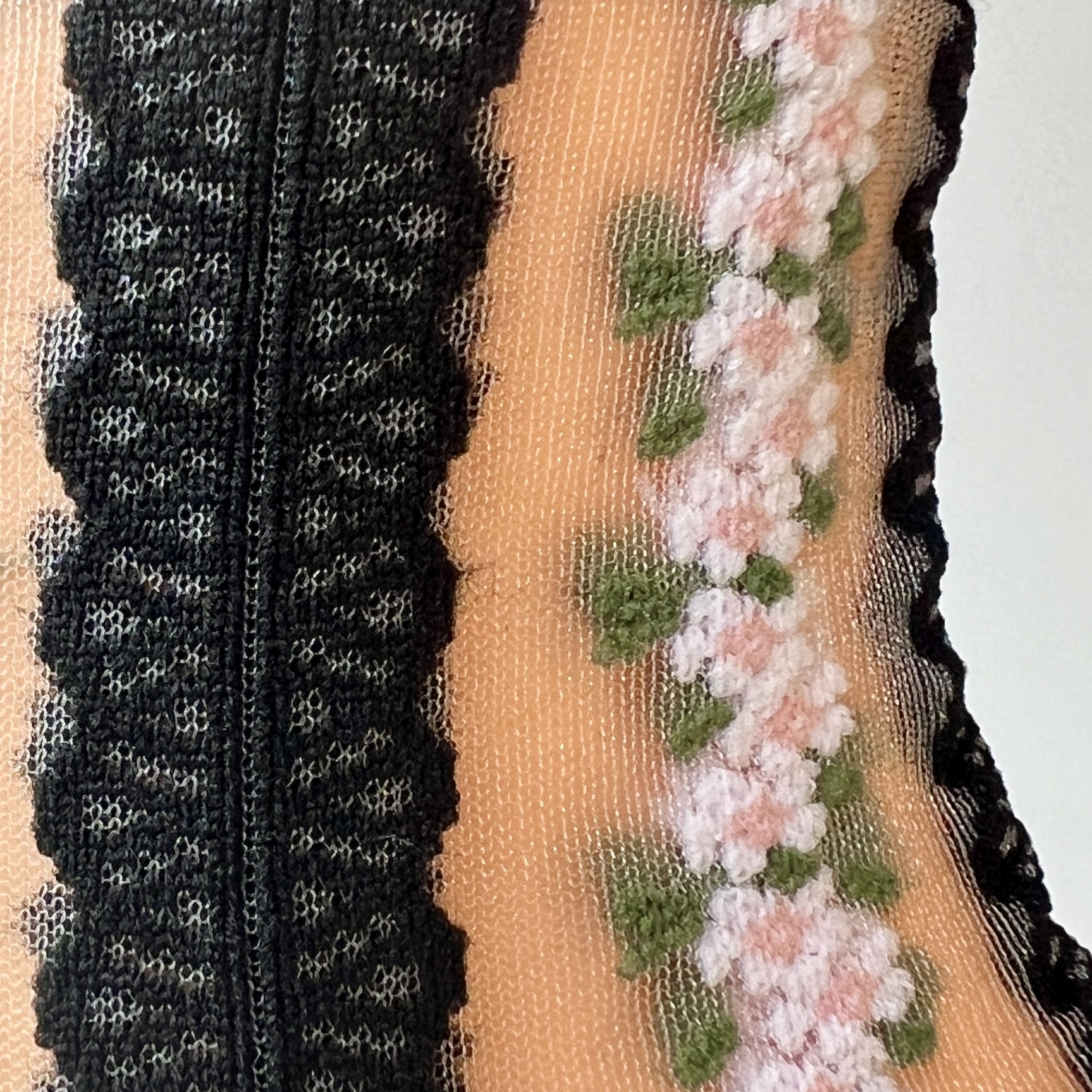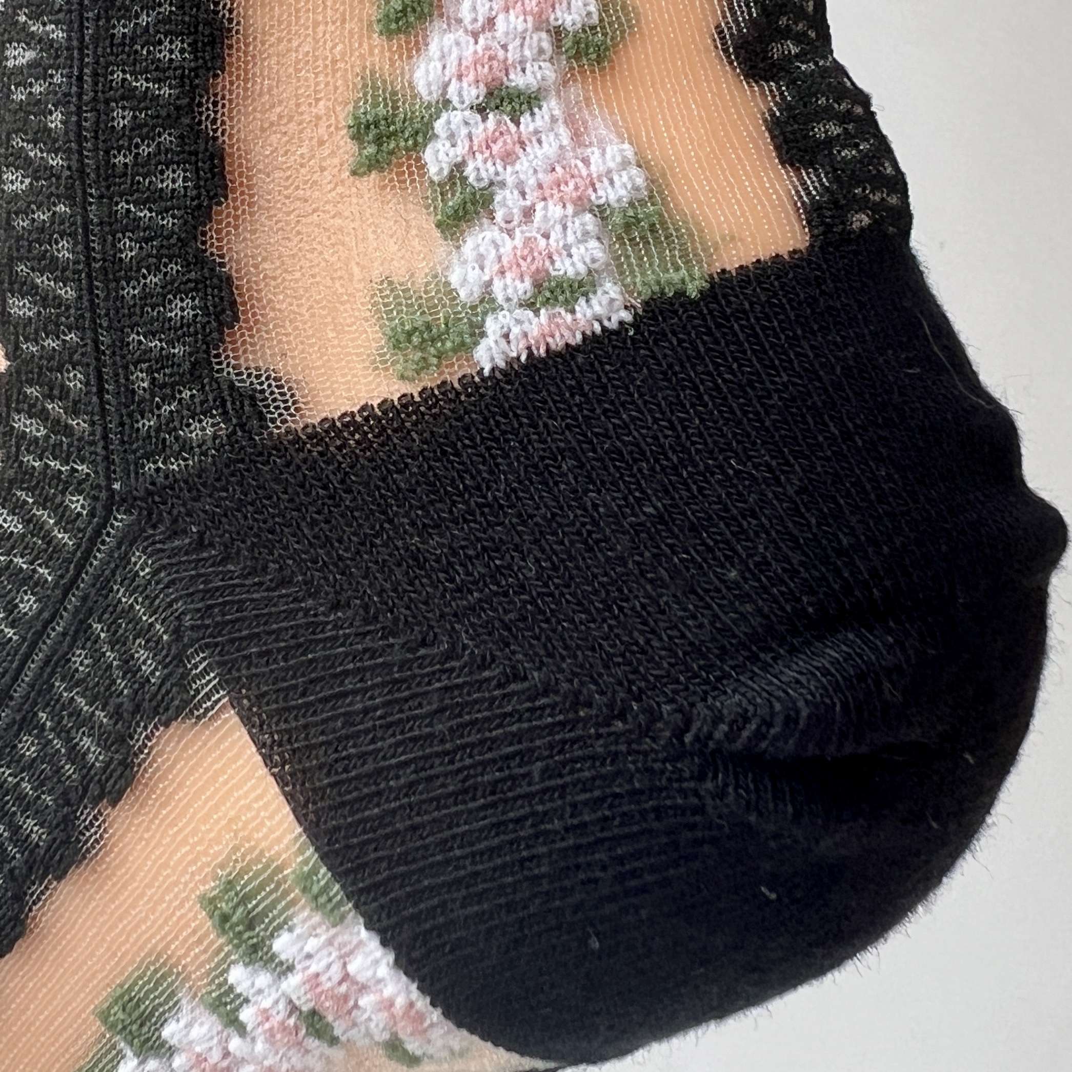 Dodaj swojej stylizacji lekkości i uroku! Te eleganckie czarne skarpetki w paski i drobne, różowe kwiatki to połączenie modnego designu i wygody. Przezroczysty, siateczkowy materiał w paski i drobne, różowe kwiatki prezentuje się niezwykle kobieco, a czarne wykończenia przy palcach, pięcie i ściągaczu dodają całości charakteru.