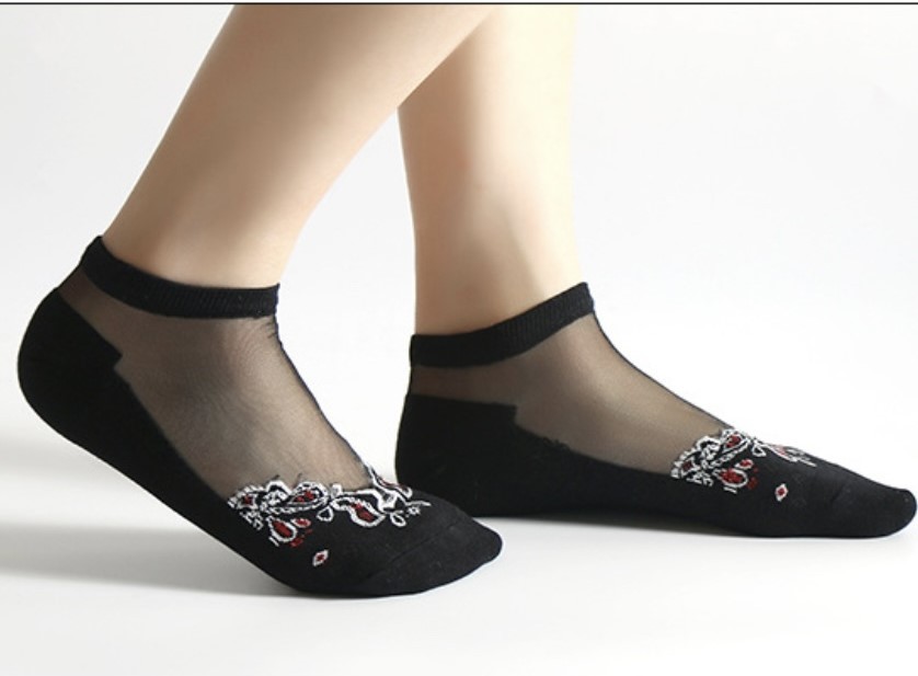 Skarpetki siateczkowe czarne z misternym haftem w kolorze bordo. Bardzo wytrzymałe.