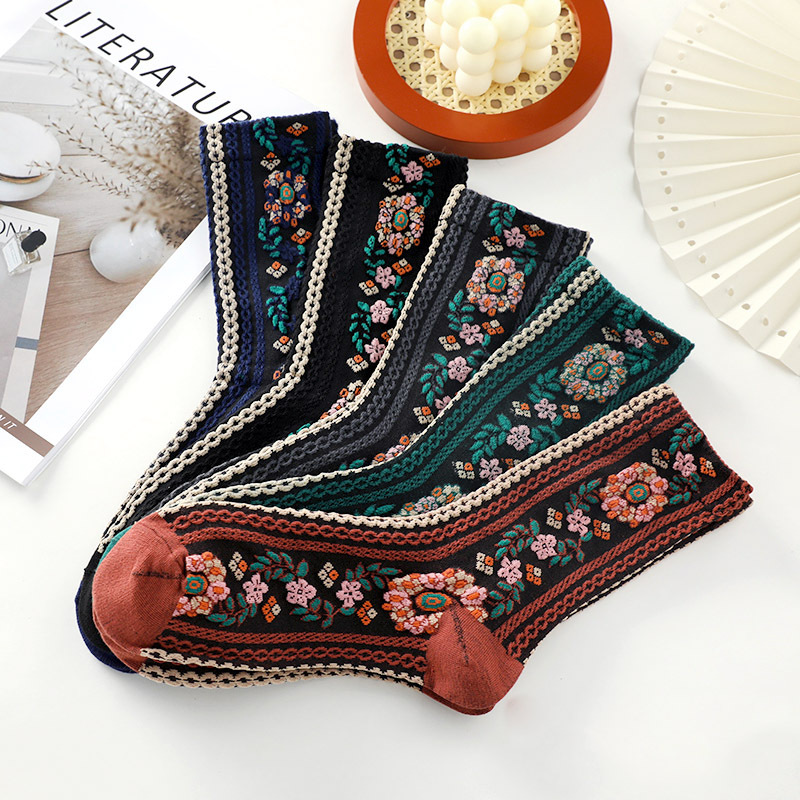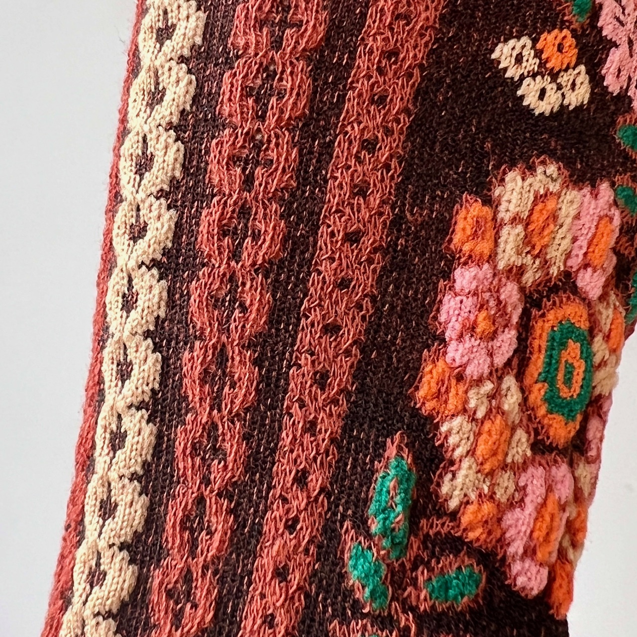 Wesołe skarpetki zielone etniczne w haft brązowe w kwiatki