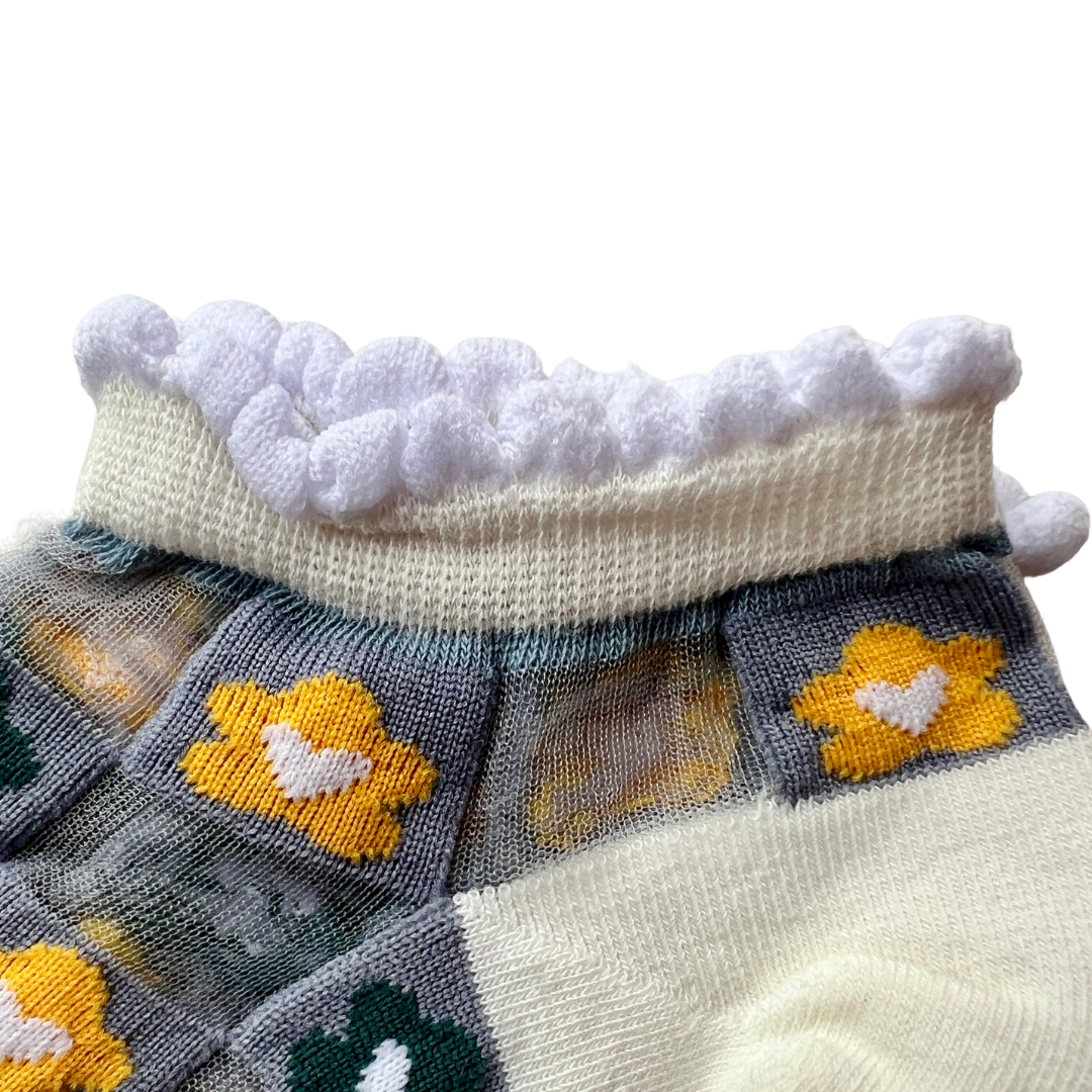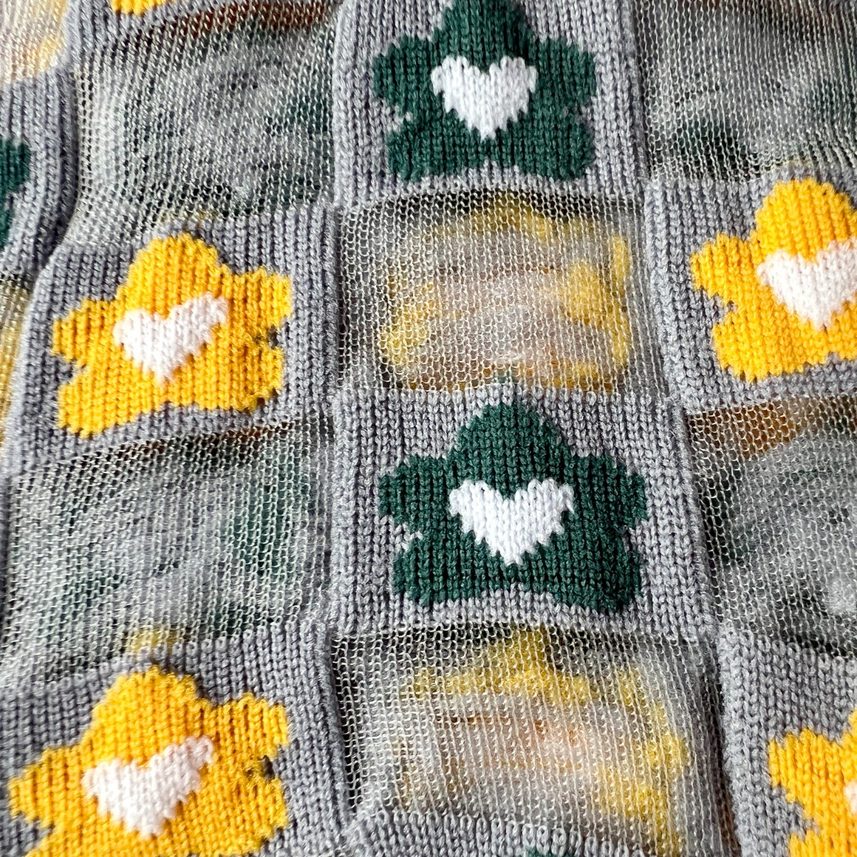 Dodaj swojej stylizacji lekkości i uroku! Te eleganckie skarpetki w żółte i zielone kwiatki oraz serduszka to połączenie modnego designu i wygody. Przezroczysty, siateczkowy materiał w żółte i zielone kwiatki oraz serduszka prezentuje się niezwykle kobieco, a czarne wykończenia przy palcach, pięcie i ściągaczu dodają całości charakteru.