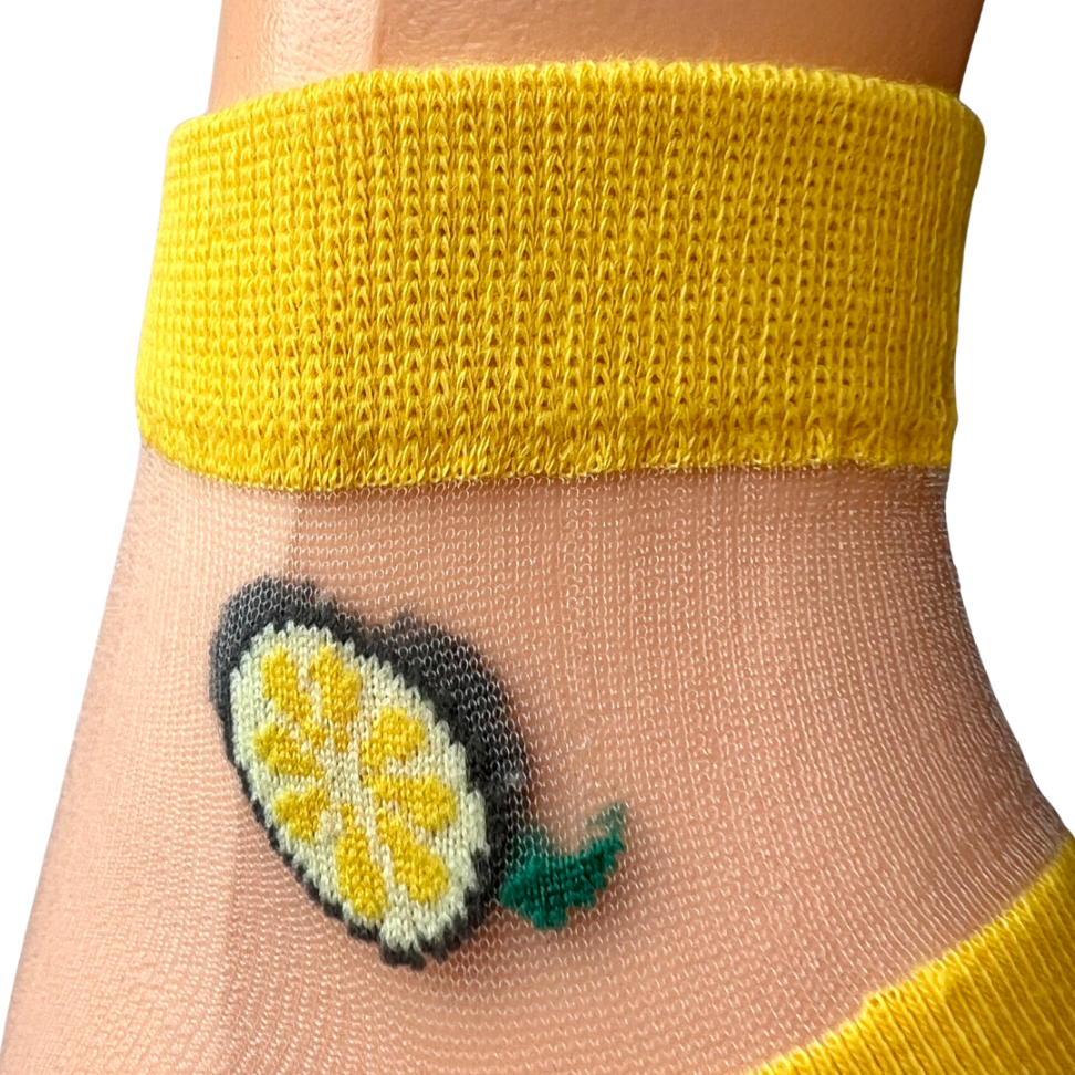 Dodaj swojej stylizacji lekkości i uroku! Te eleganckie skarpetki w zielone paski i cytryny to połączenie modnego designu i wygody. Przezroczysty, siateczkowy materiał w zielone paski i cytryny prezentuje się niezwykle kobieco, a czarne wykończenia przy palcach, pięcie i ściągaczu dodają całości charakteru.