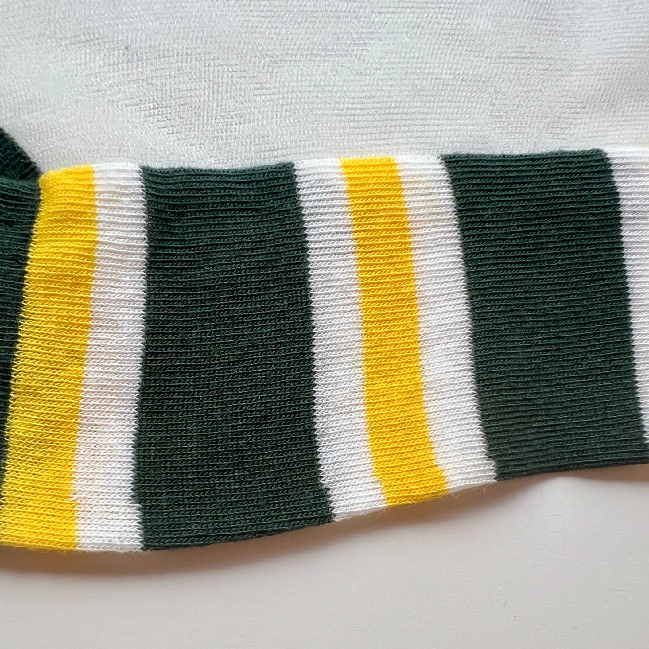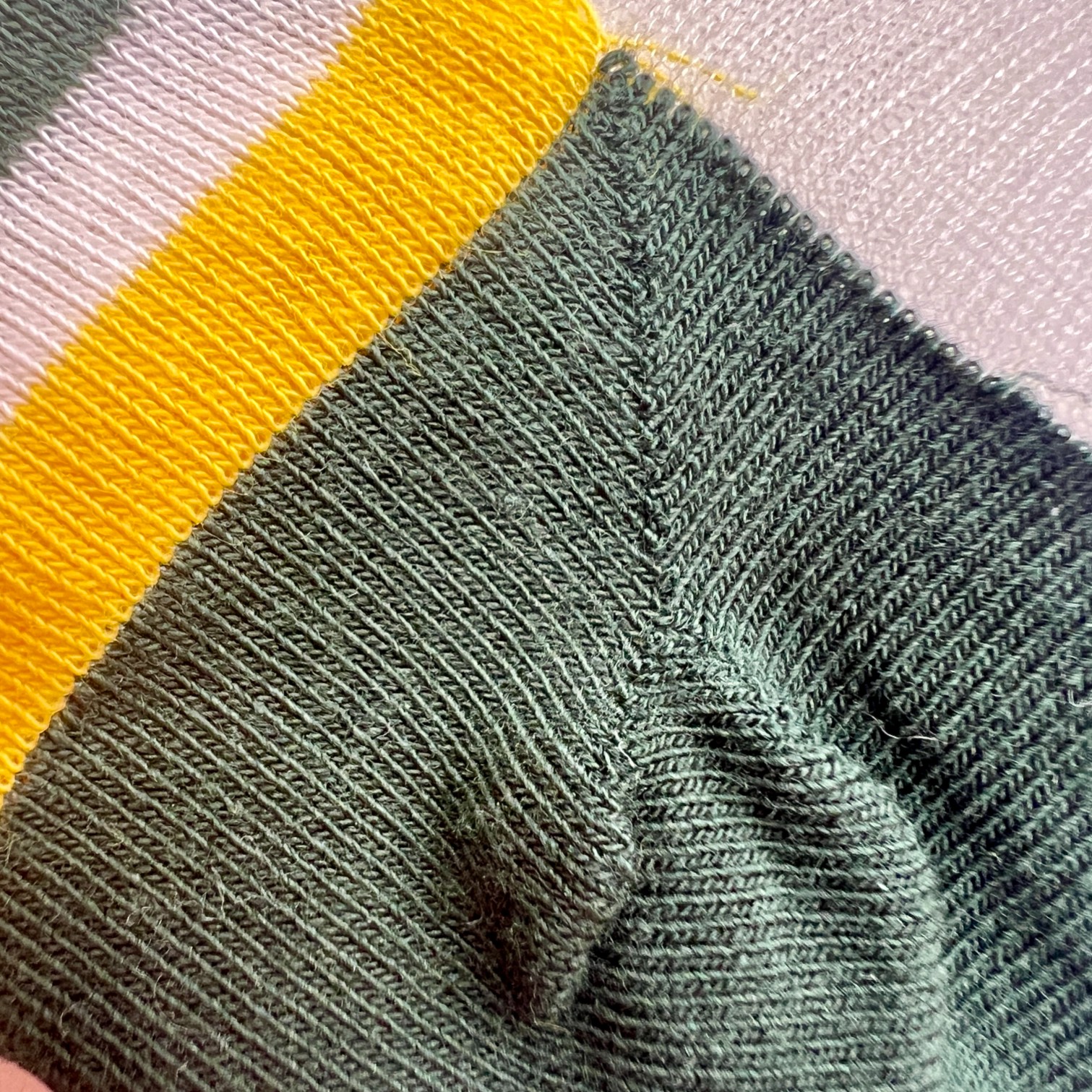 Dodaj swojej stylizacji lekkości i uroku! Te eleganckie skarpetki w zielone, żółte i białe paski to połączenie modnego designu i wygody. Przezroczysty, siateczkowy materiał w zielone, żółte i białe paski prezentuje się niezwykle kobieco, a czarne wykończenia przy palcach, pięcie i ściągaczu dodają całości charakteru.
