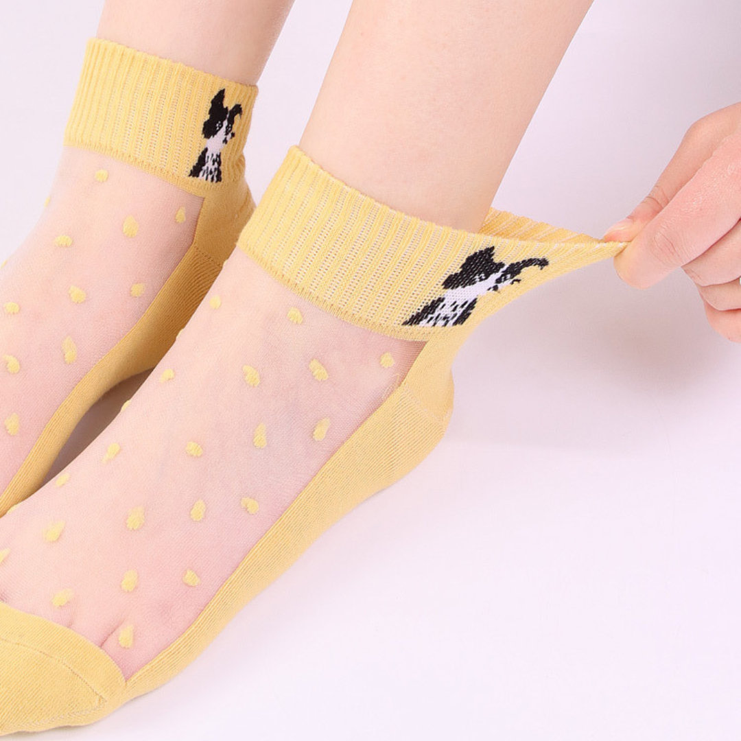Stopki żółte z mordką pieska. Wesołe. Bardzo wytrzymałe.